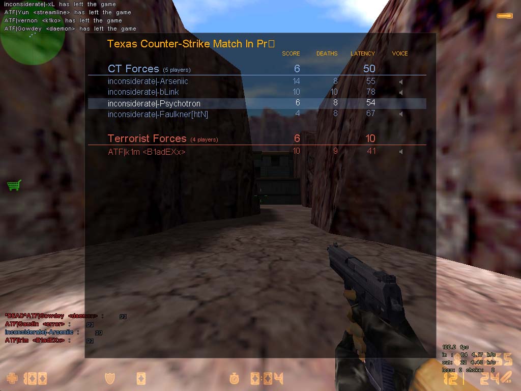 | ATF | de_nuke | 2003-04-27 | 10-14 | CT - T | CAL-M | Loss |
