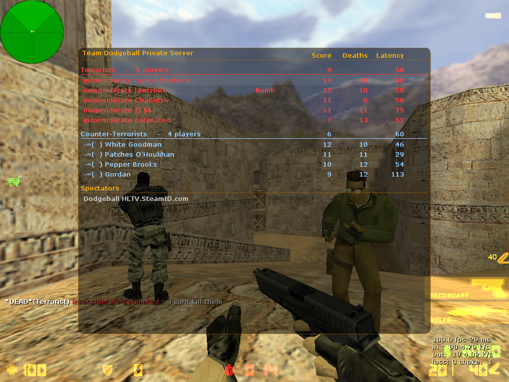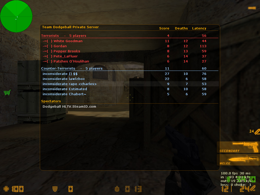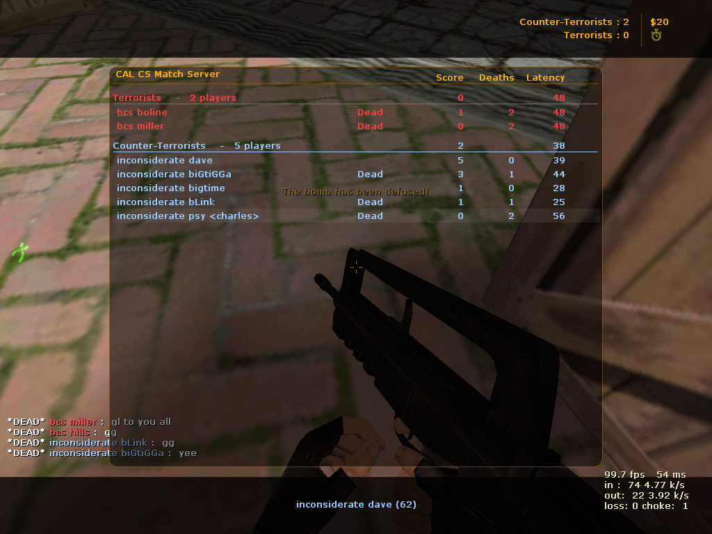 | Dodgeball | de_dust2 | 2005-05-08 | 20-10 | CT - T | CAL-M | Win |