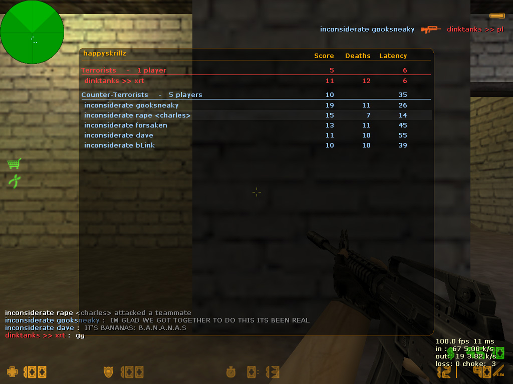 | Dink Tanks | de_train | 2005-05-25 | 17-13 | CT - T | CAL-M | Win |