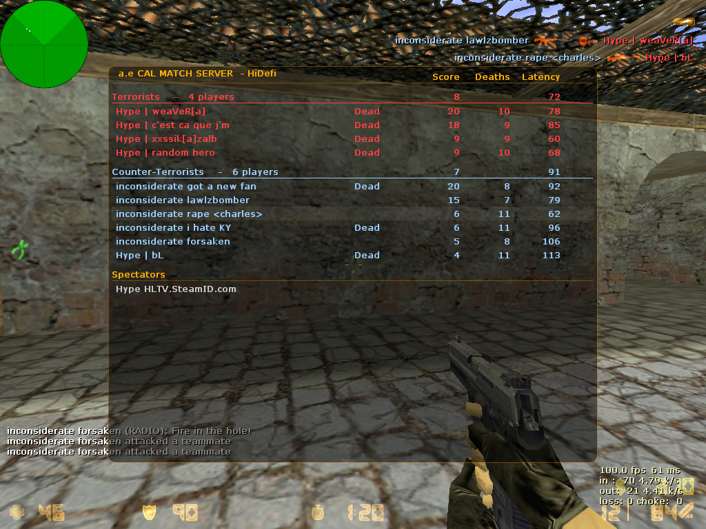 | 1hq | de_cpl_fire | 2005-08-28 | 07-23 | CT - T | CAL-M | Loss |
