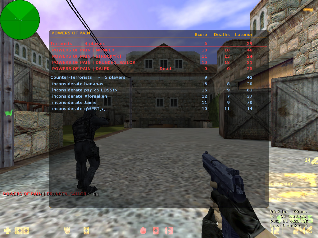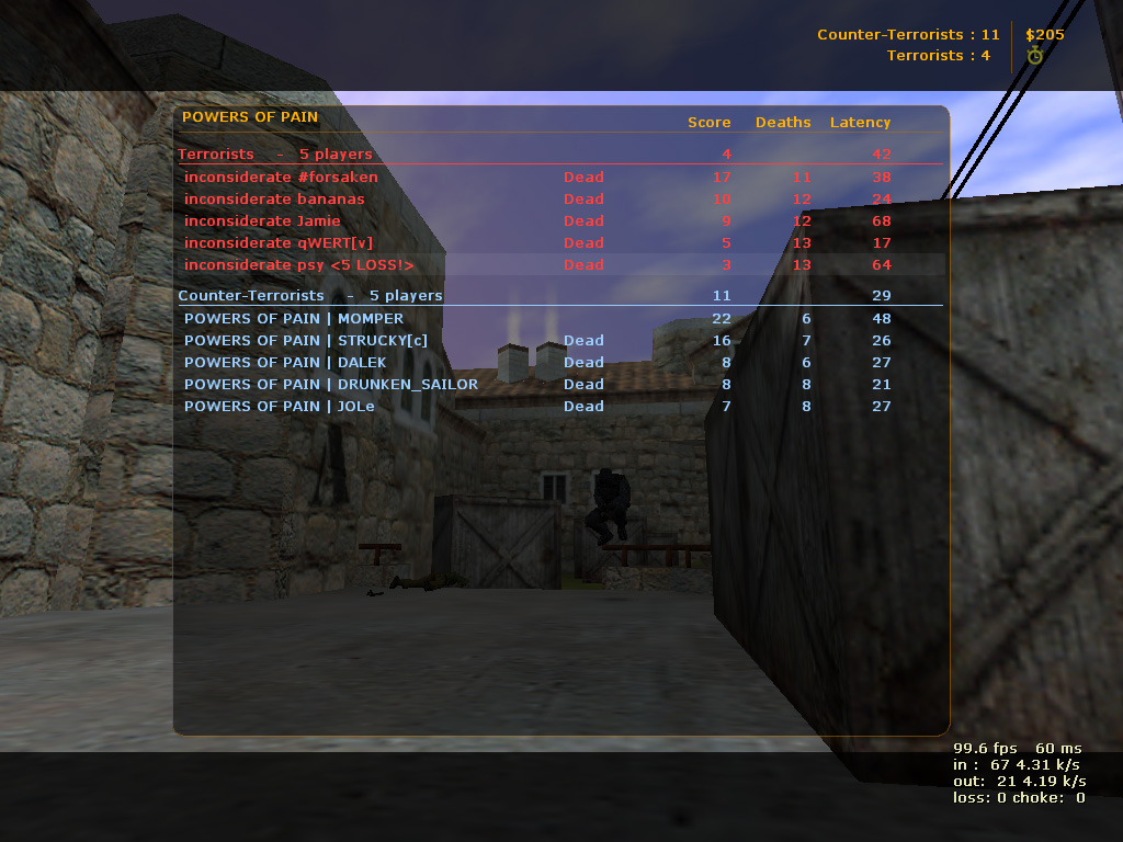 | Powers of Pain | de_cbble | 2005-08-17 | 13-17 | CT - T | CAL-M | Loss |