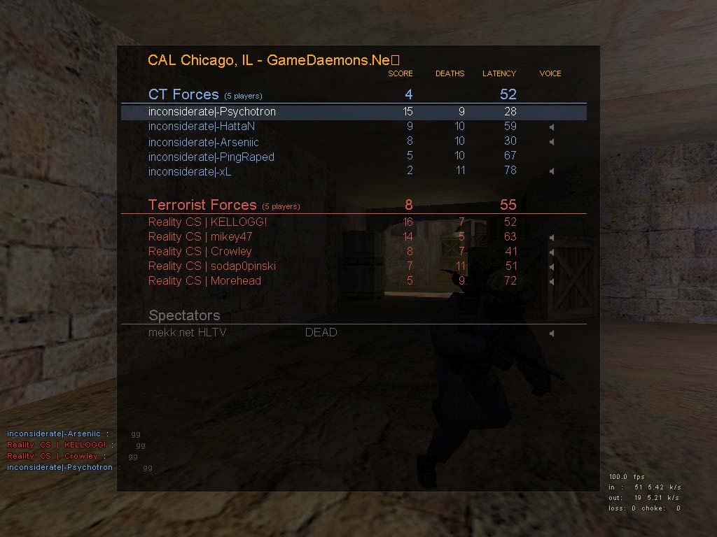 | Ronin Gaming | de_nuke | 2006-08-07 | 11-19 | CT - T | CAL-IM | Loss |